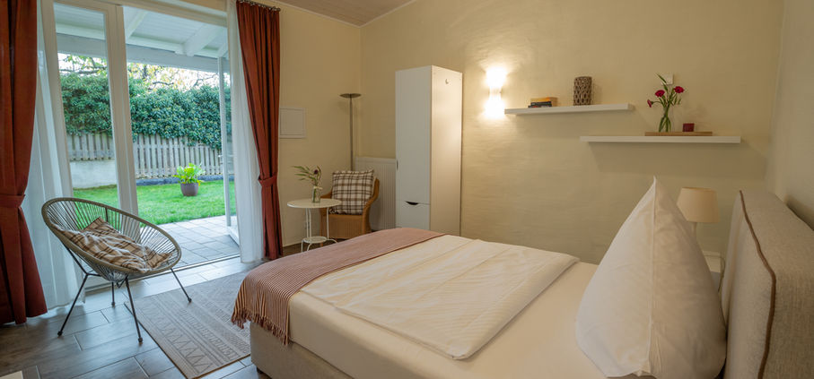 Zimmer 6 mit komfortablem Bett (1,40 breit) für 1 -2 Gäste hat direkten Zugang zum Garten. Großes modernes Bad. Keine Küche. Unter einer breiten Überdachung sitzt man gut bei Sonne und Regen. Gerne auch nur für eine Nacht.